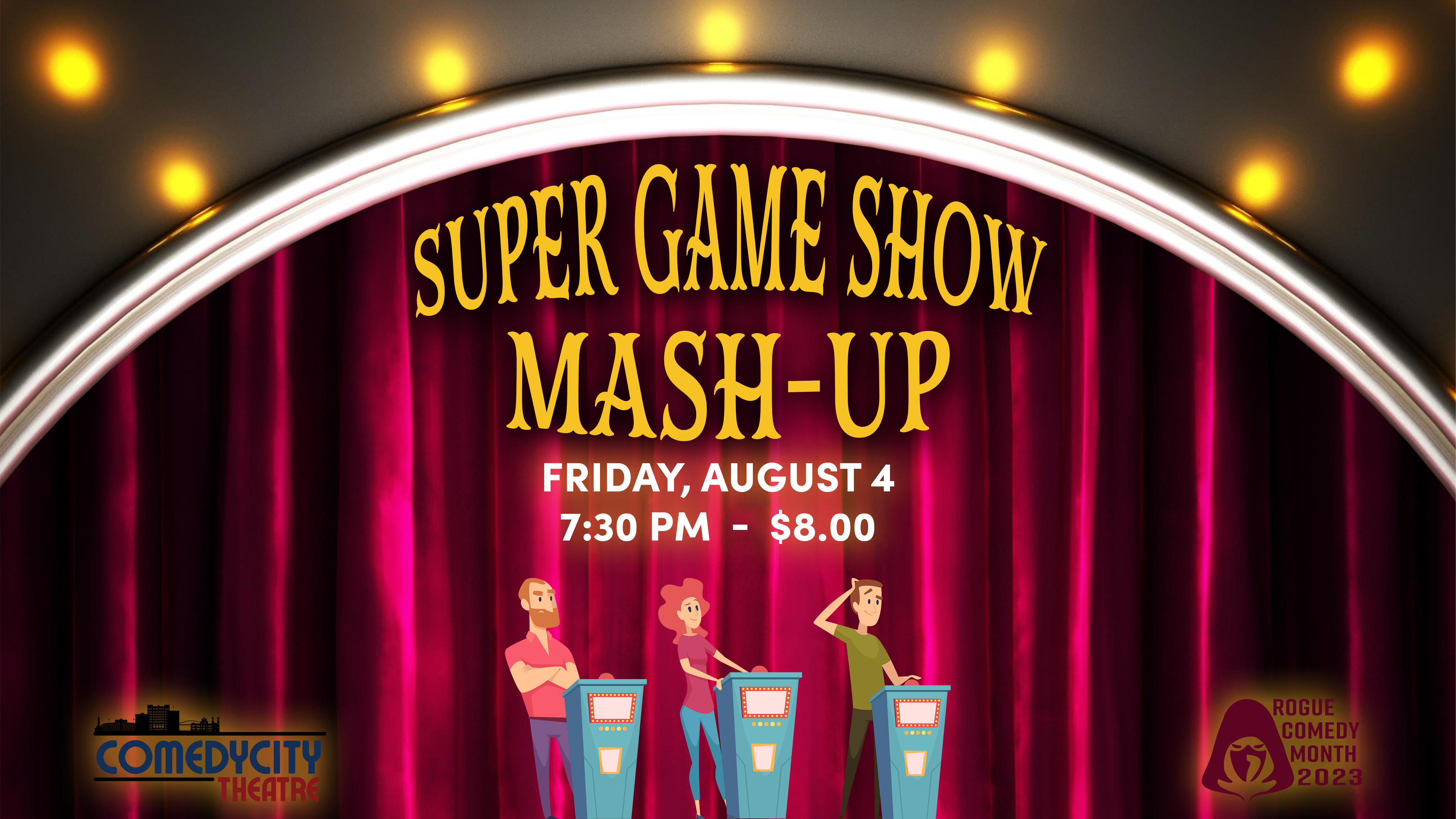 ComedyCity Theatre presents "Super Game Show Mash-Up," an electrifying event combining short-form improv games with elements of your favorite game shows. Join us for an evening of interactive fun as the audience and players compete together and against each other in ridiculous challenges. Get ready for a hilarious night of laughter and surprises at ComedyCity Theatre! "Talent Show Talent Test" (Saturday, August 5, 6:30 PM)Unleash your talent and creativity at ComedyCity Theatre's "Talent Show Talent Test." Join the fun as a group of contestants showcases their unique talents with the audience's help, then take on hilarious challenges with loaded circumstances. This entertaining event promises an interactive evening of laughter and surprises for all ages! "Pitch It!" and "Jokes!" (Saturday August 5, 8:30 PM)Don't miss the 2-for-1 showcase at ComedyCity Theatre, featuring "Pitch It!" and "Jokes!" In "Pitch It," audience suggestions inspire a movie that doesn't exist, while "Jokes!" offers an improv exploration of various joke styles. Get ready for an uproarious night filled with creativity, wit, and spontaneous hilarity! "Teen Camp Showcase" (Friday, August 11, 7:30 PM)Get ready for an uproarious display of youthful wit and boundless creativity at the "Teen Camp Showcase"! Join us for an unforgettable improv