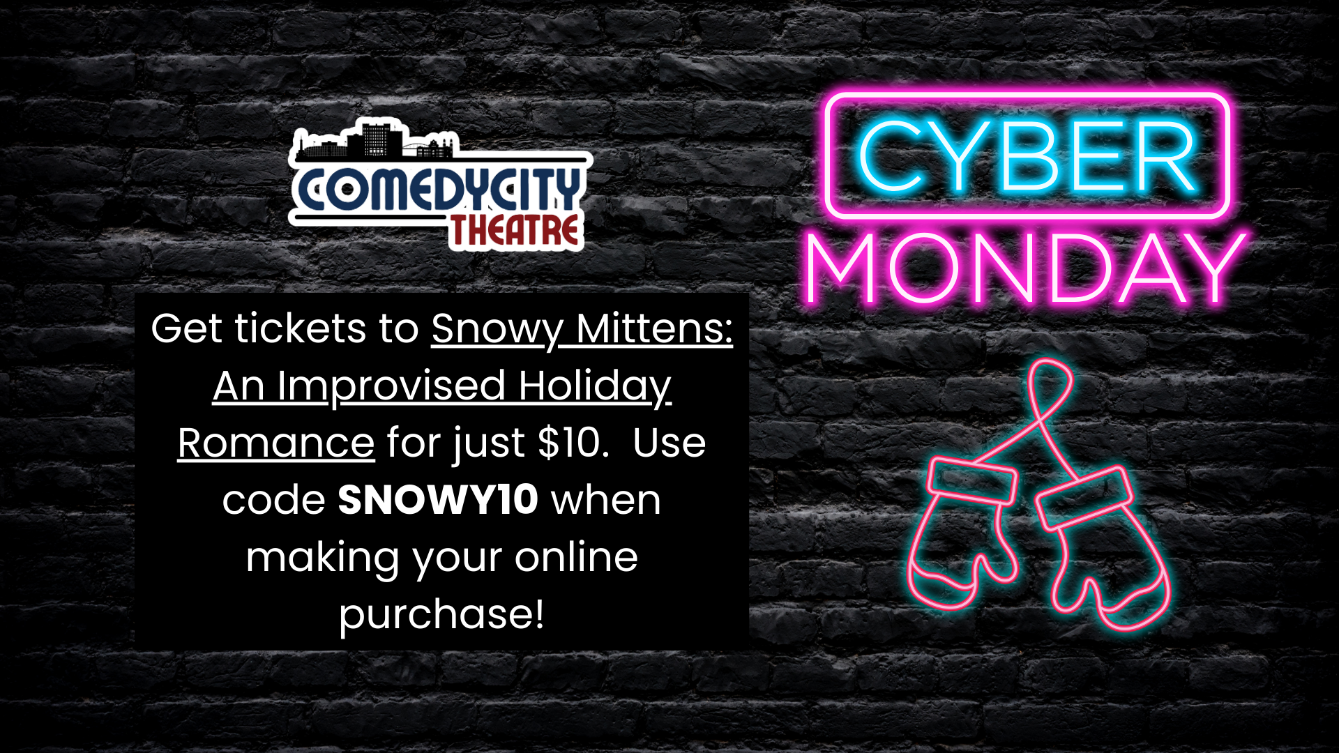 Join us for the heartwarming magic of the season at "Snowy Mittens: An Improvised Holiday Romance"! For the third year in a row, ComedyCity is back with a special holiday treat that's reminiscent of your favorite romantic holiday movies.
