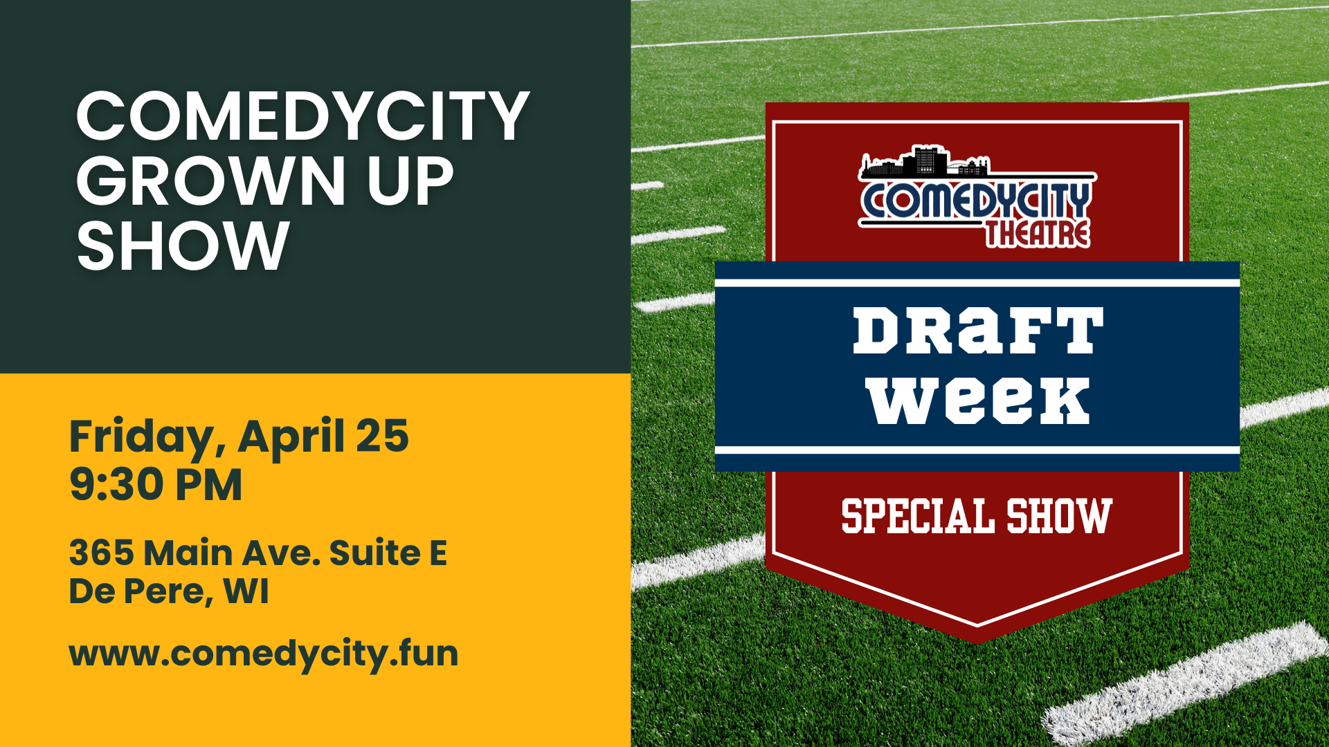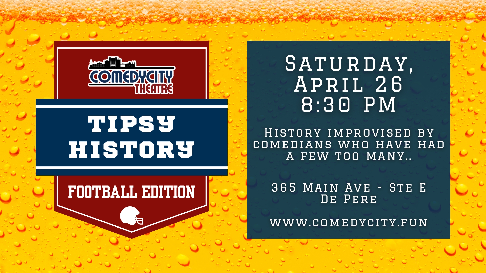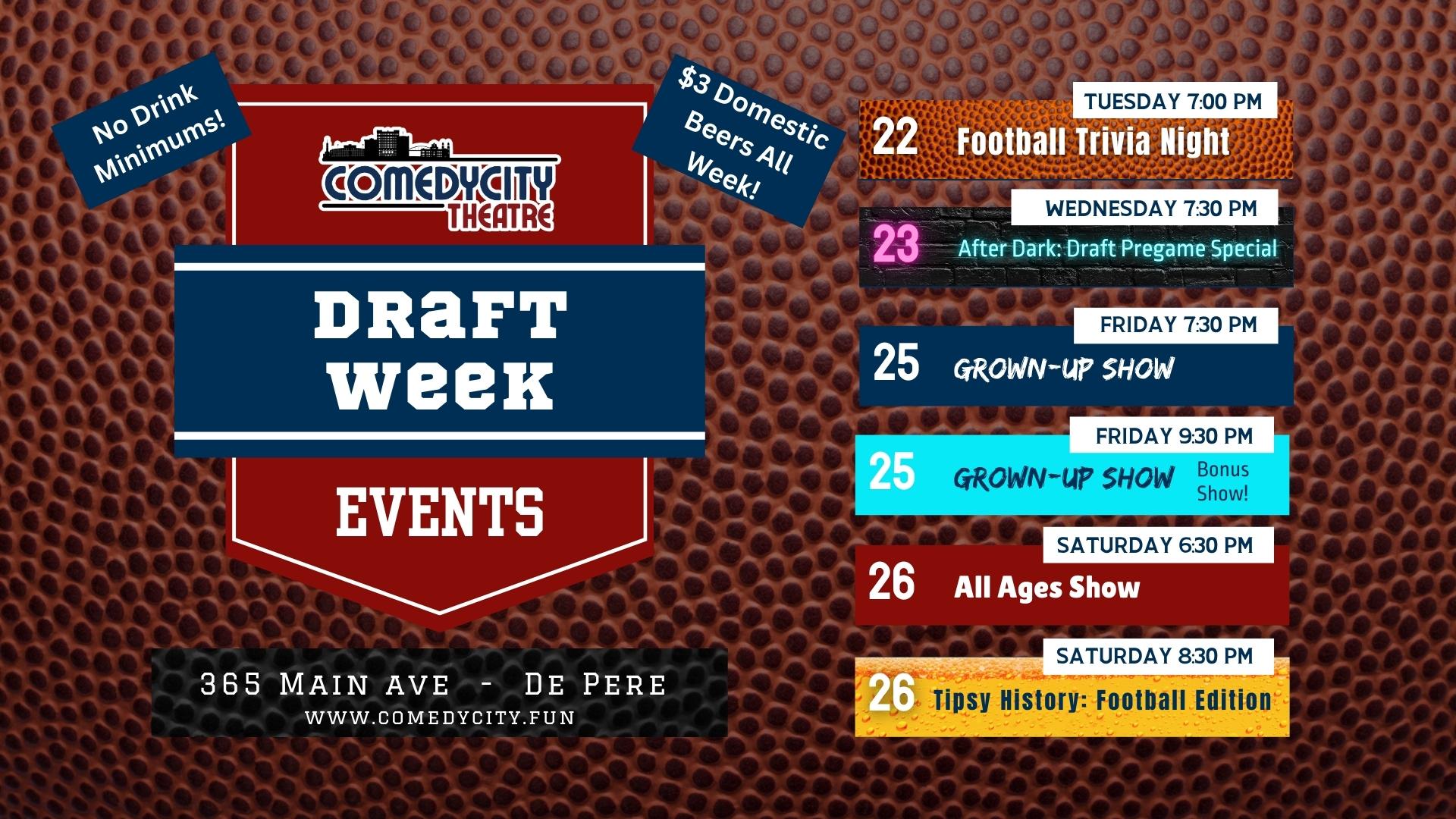 continues on Wednesday with a special pre-draft edition of ComedyCity: After Dark, and continues further on Friday with a special 9:30 Grown-Up Show. We close draft week with one of our favorites, "Tipsy History".