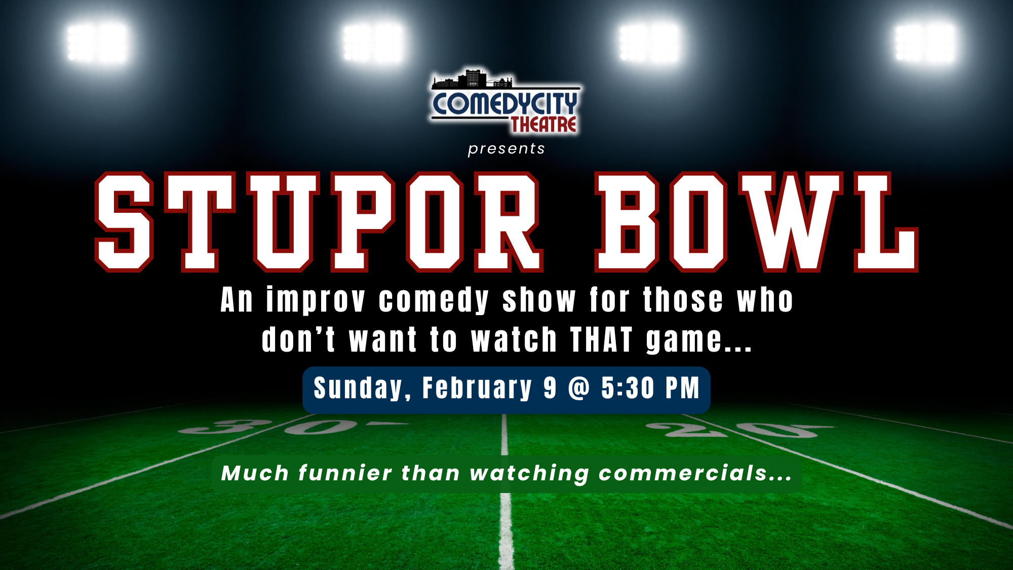 Are you uninterested in what is supposed to be the biggest game of the year? We're feeling the same, so we thought we'd do a little improv comedy for you. Join us the evening of Sunday, February 9 at 5:30 PM for the Stupor Bowl. Our crew is ready to improvise like Mahomes trying to get the ref to throw a flag. Tickets are just $10.