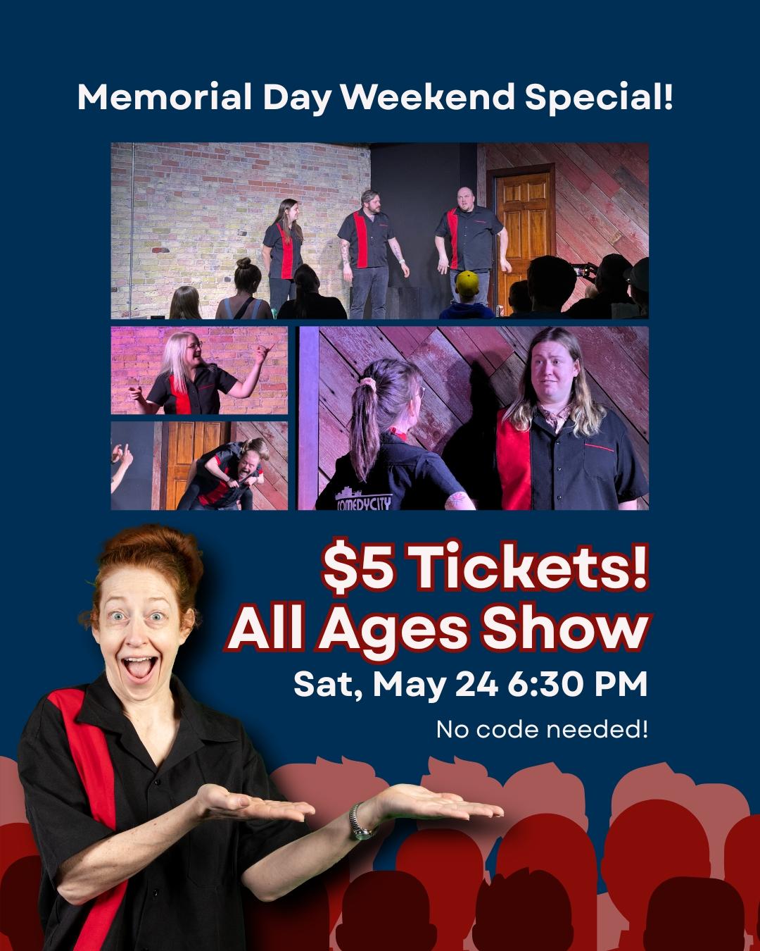 This Saturday is the unofficial start of summer! Why not start it with a fun time for the whole family? Join us for our All Ages Show this Saturday, May 14 at 6:30 PM for a special price. Tickets for the show are $5. No promo code is necessary.