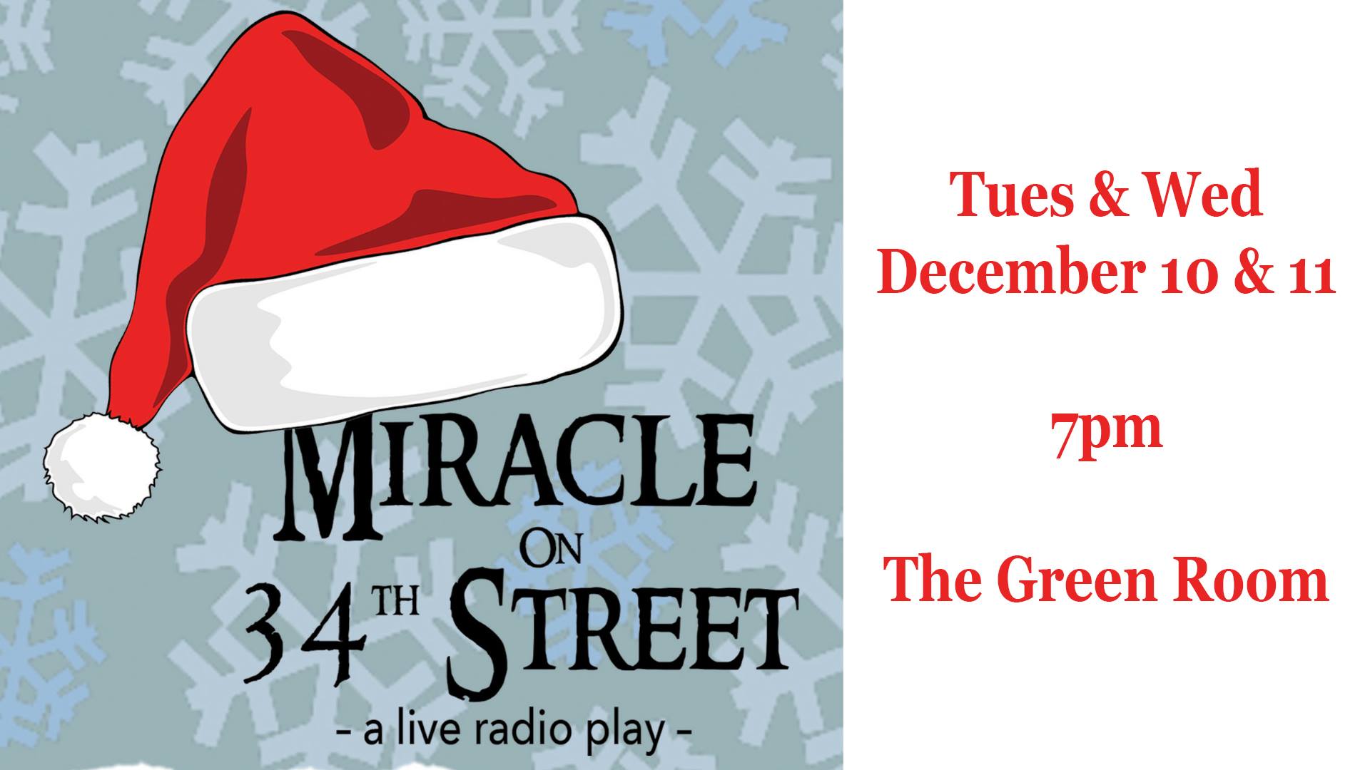 What better way to get into the holiday spirit than with the iconic classic "Miracle on 34th Street!" The Green Room Players are bringing the 1947 movie to life as a radio play, complete with live sound effects and a bundle of holiday cheer.